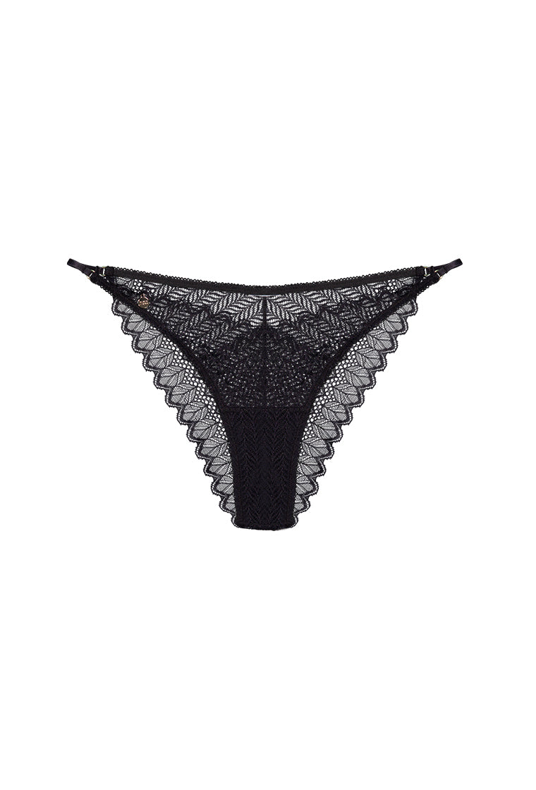 A very special Brazilian brief made of floral lace featuring a bikini design featuring elastic straps on the sides with metallic appliqués, a low rise, and a crossover design at the front. Available in four colors.