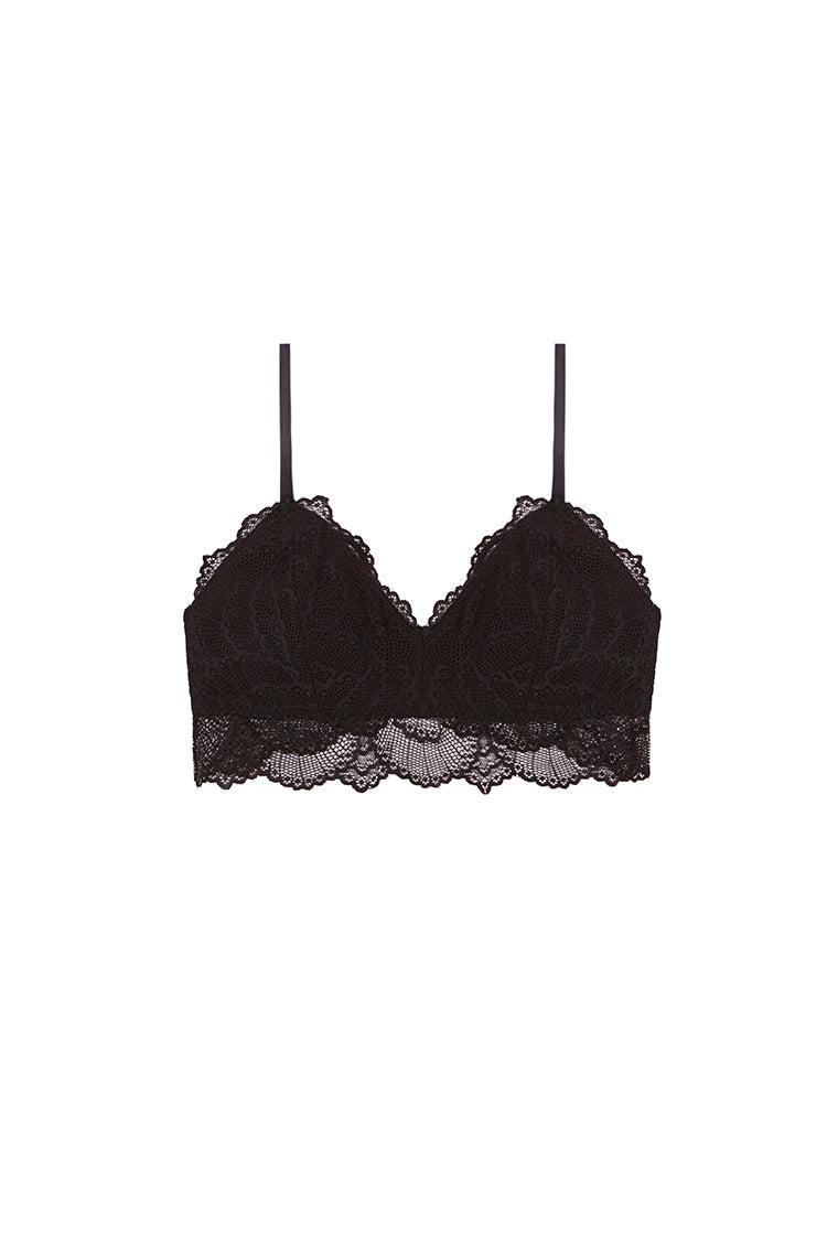 Un sujetador de encaje geométrico semitransparente con copas triangulares, con relleno ligero extraíble, tirantes regulables y cierre trasero con dos corchetes. Su forro de algodón súper suave te hará olvidar que llevas sujetador.